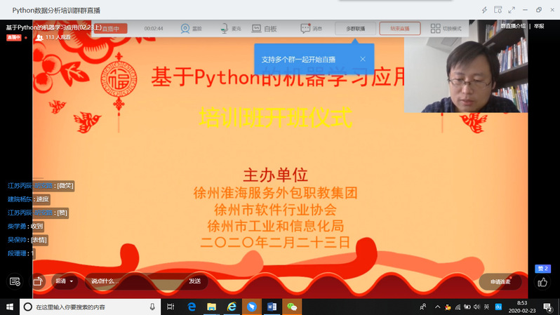 2月23日,徐州淮海服务外包职教集团2020年第一期企业培训《基于Python的机器学习应用》线上准时开班。此次培训是职教集团根据年初工作计划,经过精心策划,并报市教育局领导同意,由365英国上市公司、徐州市工业和信息化局、徐州市软件行业协会共同举办。
