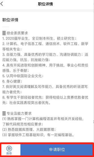 2)、点击“招聘会”按钮,进入招聘会列表页,选择“简历投递”,就可查看“岗位推荐信息”,点击进入您选择的“岗位”进入,在相应板块就就可以获取“企业介绍”和“职位详情介绍”,在职位列表中选择您心仪职业后,就可投递你心仪的岗位了