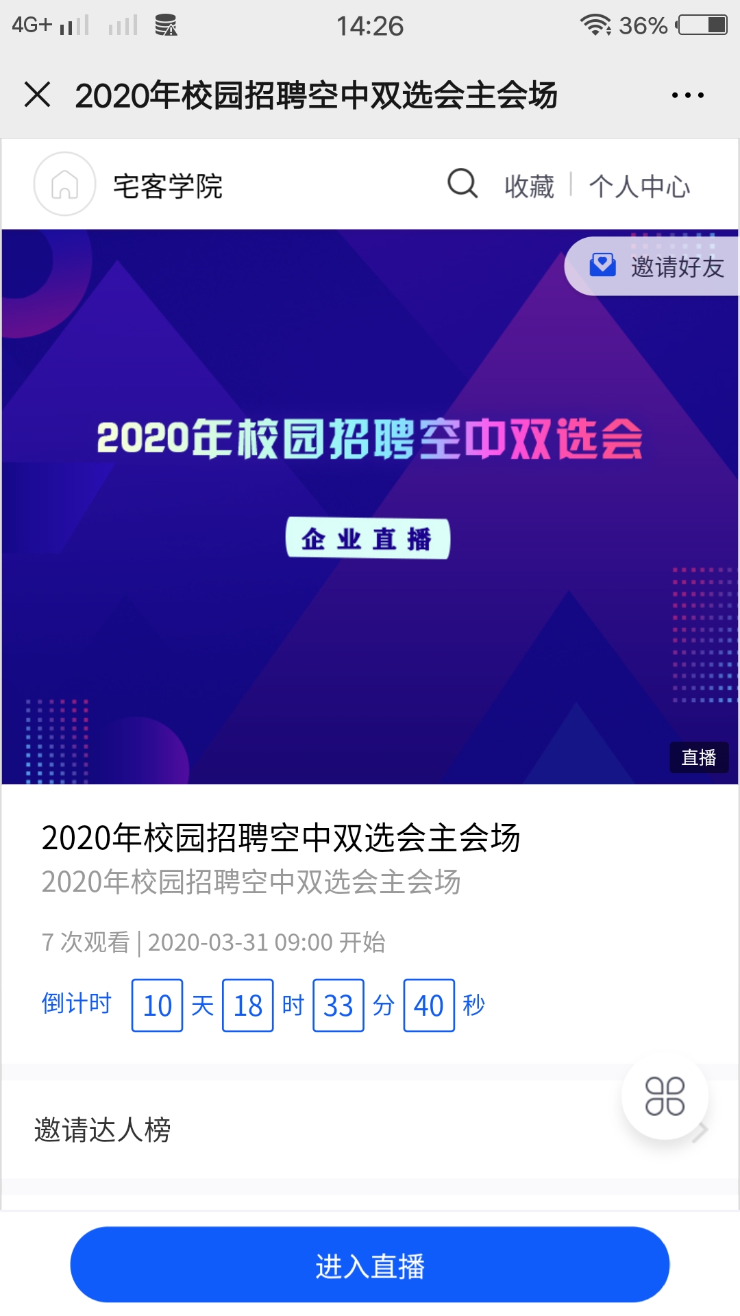 员工们进去后不要慌张,待2020年校园招聘空中双选会正式开始(开始时间为3月31日9:00-15:00),可扫下图二维码进入首页,在2020年3月31日校园招聘空中双选会(目前扫码观看不了,只能看到倒计时和海报以及其他地域的空中招聘)
