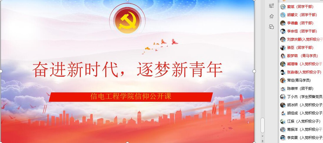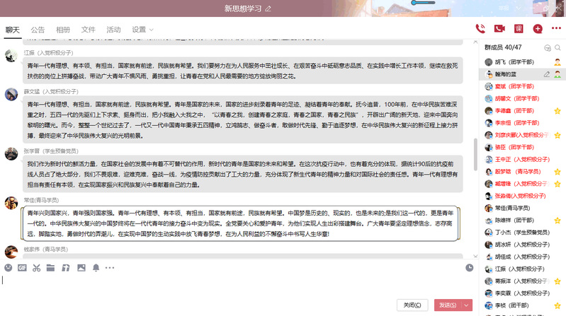 然后,信电公司各班级以团支部为单位,由讨论组成员在支部内分享学习材料和学习心得,同时引导支部团员青年积极参与讨论。通过此次线上讨论活动,同学们深化了对新时代青年的认知与理解,进一步强化了青年的责任与担当意识,激发和凝聚了抗疫的精神动力。大家认识到了青年一代在国家发展中的重要作用,明确了大国担当、中国温度,学习了党的先进理论知识。人无精神则不立,国无精神则不强。在新冠疫情暴发以来,我们每一个身在其中的中国人都能深切地感受到一种令人振奋的精气神充满全社会、贯穿全过程。希望广大青年能够继续努力,学有所获,根植爱国情怀、谱写青春赞歌。