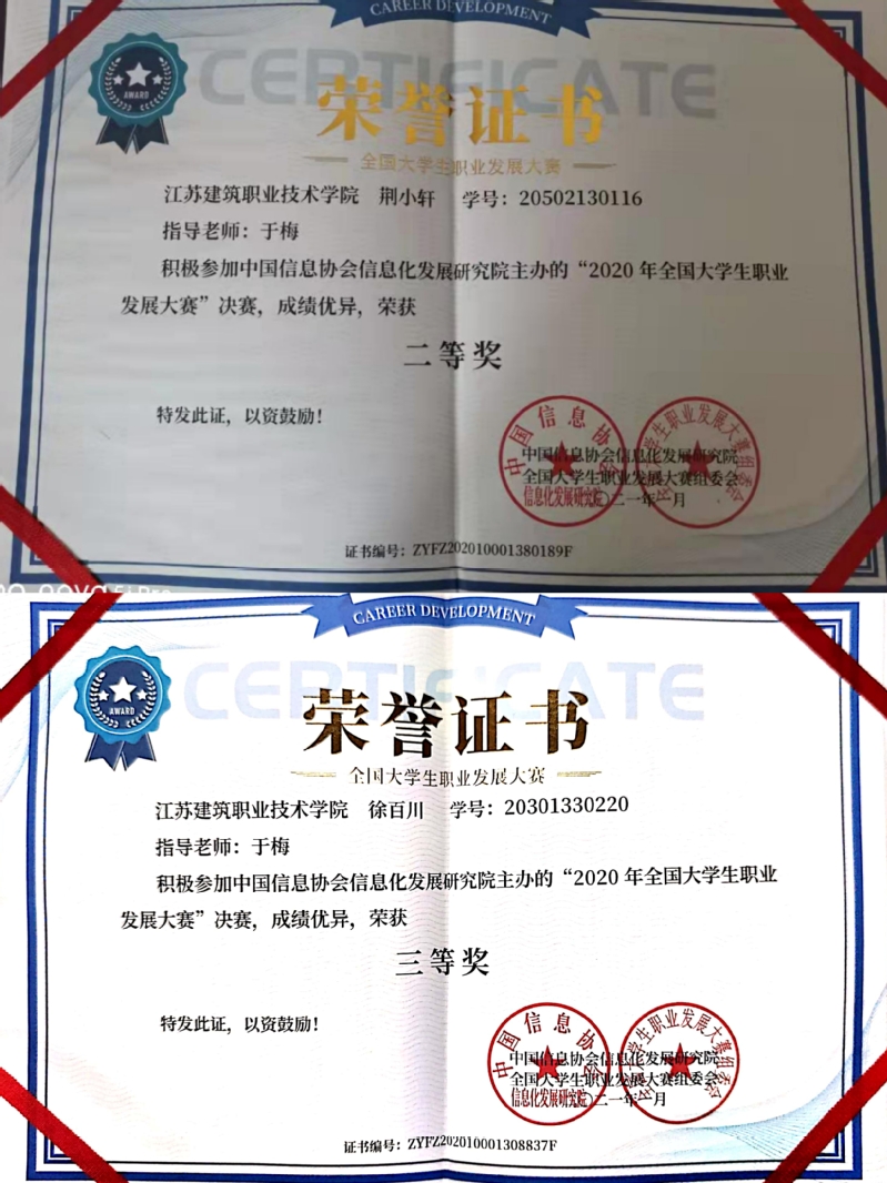 近日由中国信息协会信息化发展研究院主办的2020年全国老员工职业发展大赛”中,公司电子20-1班荆小轩同学获得大赛二等奖,软件20-2班徐百川同学获得大赛三等奖。