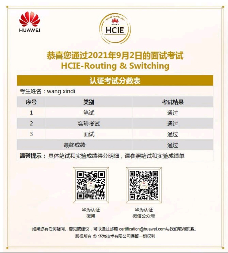 王歆迪同学在校三年间刻苦学习专业知识,经过不懈努力和老师的精心指导,顺利通过了笔试、机试和面试,获得HCIE-Routing&Switching认证。华为认证有HCIA(初级)、HCIP(中级)、HCIE(高级)三个等级。其中,HCIE是近几年华为推出的ICT技术专家级认证,定位于大中型复杂网络的构建、优化和管理,通过HCIE考试证明技术水平达到了专家级水平。HCIE认证从2013年至今,通过人数不到一万人,备受业界认可,已经成为业内的金字招牌。