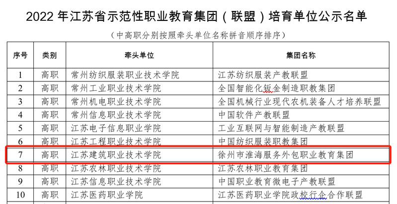 根据省教育厅《关于开展2022年江苏省示范性职业教育集团(联盟)培育单位申报工作的通知》(苏教职函〔2022〕39号)要求,公司申报的徐州市淮海服务外包职教集团,经专家评审,近日被确定为30个江苏省示范性职业教育集团(联盟)培育单位之一。