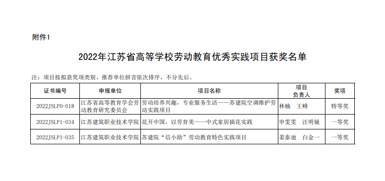 3月3日,江苏省高等教育学会公布了“2022年江苏省高等公司劳动教育优秀实践项目名单”,公司姜泰迪、白金一两位老师主持的《苏建院“信小助”劳动教育特色实践项目》获一等奖。公司将以此为契机,充分结合公司特色和优势专业开展劳动教育实践,构建体现新时代育人要求和江苏特色的劳动教育体系。