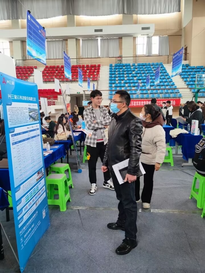 会后,在公司老师的带领下,所有员工统一到体育馆参加2023年春季校园招聘会。
