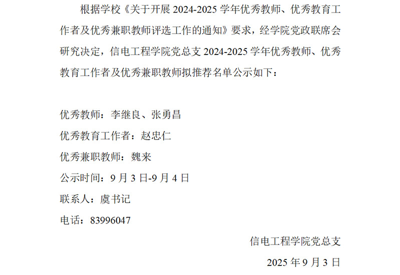 信电工程公司党总支2024-2025学年优秀教师、优秀教育工作者及优秀兼职拟推荐名单公示